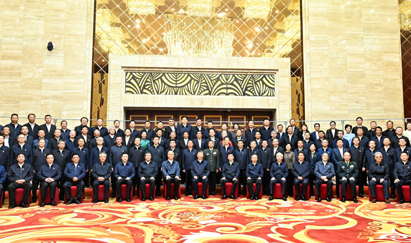 習(xí)近平等來到接見現(xiàn)場時,全場響起長時間熱烈掌聲。習(xí)近平向大家揮手致意,不時同代表親切交流,并同大家合影留念。